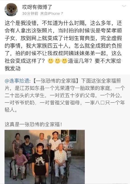 真相:照片中這位“唯一”的年輕人@哎呀有微博了 通過(guò)個(gè)人微博辟謠表示,家中并不是僅有這幾個(gè)人,自己還有兄弟姐妹、叔叔阿姨,整個(gè)家族加起來(lái)有四五十人。至于這張照片,是幾年前為了宣傳孝順老人而配合拍攝,沒(méi)讓其叔叔阿姨妹妹弟弟出鏡。
