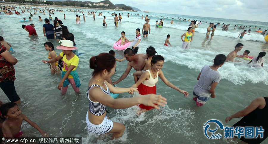 2014年6月2日,海南省三亞市,端午節(jié)當(dāng)天,上萬名市民及游客踴到大東海洗龍水,熱熱鬧鬧過端午節(jié)。上萬市民及游客洗龍水。圖片來源:東方ic