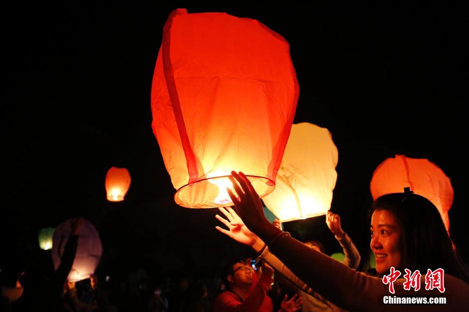 11月3日晚,在上海舉行的一場名為“點亮命星,我要脫單”的祈福活動吸引了百名單身男女參加。他們用集體放飛孔明燈的方式為自己祈福,希望早日“脫單”。中新社發(fā) 湯彥俊 攝