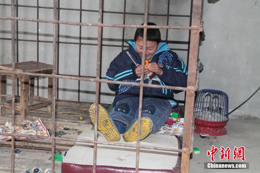 后來(lái),小旺的力氣越來(lái)越大,手腕的皮膚被鐵鏈弄得通紅,鐘科福心疼的很。2014年3月,實(shí)在沒(méi)辦法的鐘科福請(qǐng)人在家中焊制一個(gè)2平方米的鐵籠,在里面放了兩塊海綿,一個(gè)小木凳,一個(gè)尿桶。為了讓關(guān)起來(lái)的小旺能打發(fā)時(shí)間,鐘科福又把別人丟棄的麻將放在鐵籠里供他玩耍!拔乙膊蝗绦倪@樣關(guān)他,學(xué)校不愿意收他,我不出去打零工,家里就揭不開(kāi)鍋!辩娍聘Uf(shuō)。
