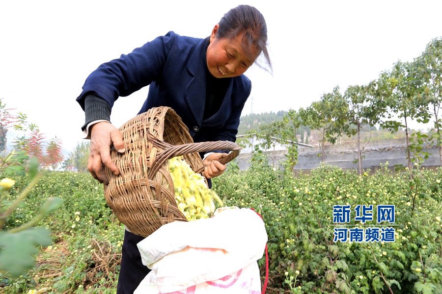 10月24日,河南省林州市茶店鎮(zhèn)李家莊村,胡家溝藥材種植專業(yè)合作社社員把采摘的菊花從籃子里倒入口袋中。
