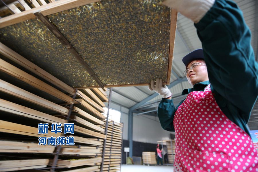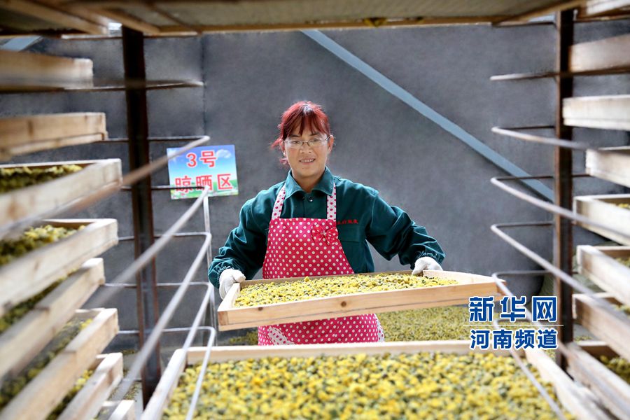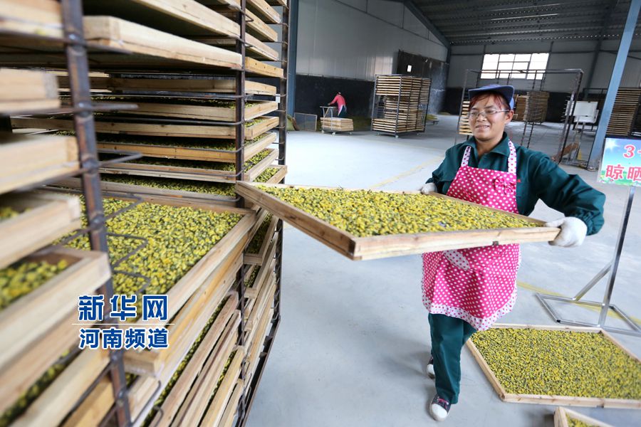2015年10月24日,河南省林州市茶店鎮(zhèn),林州市太行益友菊品有限公司生產(chǎn)車間,員工郝海芳正在把殺青后的菊花裝入烘干車。