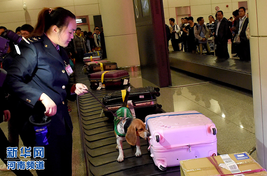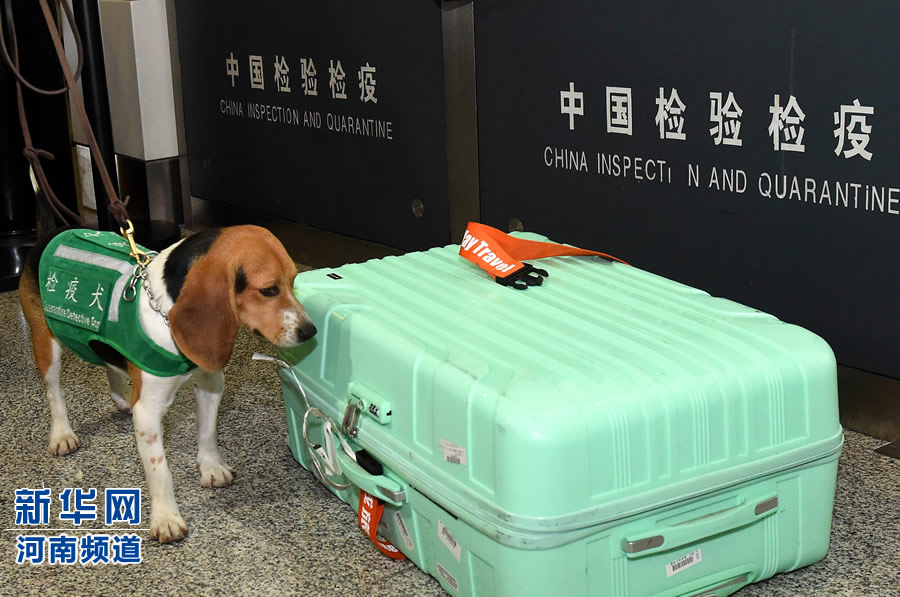 當(dāng)日,兩只檢疫犬出現(xiàn)在鄭州新鄭國際機(jī)場,幫助工作人員檢查入境旅客的攜帶物。據(jù)介紹,河南出入境檢驗檢疫局為了有效提高入境旅客禁止入境攜帶物的截獲率,引進(jìn)檢疫犬,形成“人-機(jī)-犬”三位一體的查驗?zāi)J健?/p>
