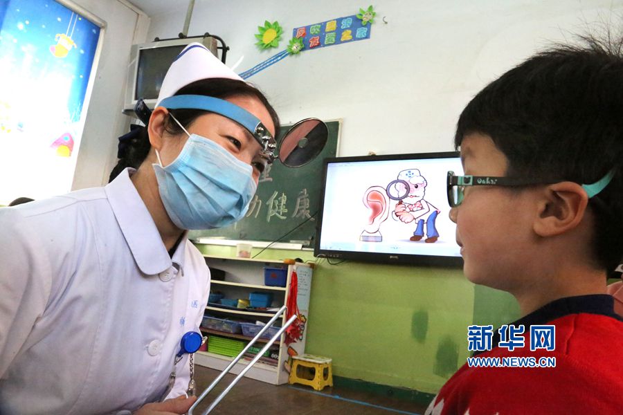 2016年3月2日,河南省安陽市婦女兒童活動(dòng)中心幼兒園,來自安陽地區(qū)醫(yī)院耳鼻喉科的醫(yī)生曹艷利正在和大三班的任博森小朋友親切交流并用音叉(聽力檢測儀)為其做聽力檢查。