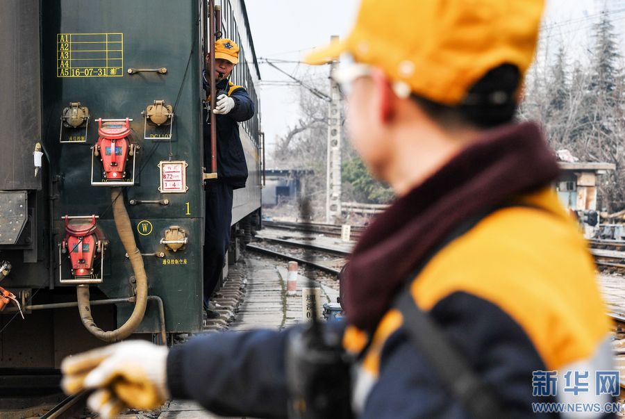 1月24日,調(diào)車(chē)長(zhǎng)程浩在進(jìn)行調(diào)車(chē)作業(yè)。 春節(jié)臨近,鐵路迎來(lái)節(jié)前客流高峰。鐵路運(yùn)輸工作中,離不開(kāi)一群為火車(chē)“穿針引線(xiàn)”的人——調(diào)車(chē)員,他們24小時(shí)不間斷輪班,保證列車(chē)按時(shí)出入庫(kù),并根據(jù)車(chē)次、客流的變化,對(duì)列車(chē)車(chē)廂進(jìn)行拆分和重新編組,保障春運(yùn)期間列車(chē)安全、準(zhǔn)時(shí)運(yùn)送旅客。 鄭州火車(chē)站運(yùn)轉(zhuǎn)車(chē)間調(diào)車(chē)長(zhǎng)程浩說(shuō):“我們的工作是把一節(jié)節(jié)車(chē)廂編組成一列火車(chē),將其中有問(wèn)題的車(chē)廂換掉,送檢、清洗,再將整列火車(chē)?yán)交疖?chē)站發(fā)車(chē),形象點(diǎn)說(shuō)就是為火車(chē)穿針引線(xiàn)!痹卩嵵莼疖(chē)站運(yùn)轉(zhuǎn)車(chē)間,調(diào)車(chē)小組一般由5人組成:一名調(diào)車(chē)長(zhǎng),四名組員。組長(zhǎng)負(fù)責(zé)指揮調(diào)車(chē)任務(wù),組員負(fù)責(zé)檢查和監(jiān)督列車(chē)車(chē)廂之間的分解與連掛,為車(chē)輛進(jìn)行排風(fēng)、摘管等。 春運(yùn)期間,鄭州火車(chē)站運(yùn)轉(zhuǎn)車(chē)間平均每天要對(duì)70余列近1300輛車(chē)進(jìn)行調(diào)車(chē)作業(yè),比平時(shí)增加30%左右的工作量。 新華社記者 李博 攝