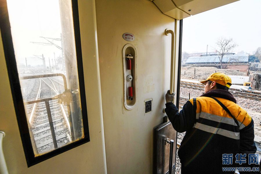 1月24日,一名調(diào)車(chē)員在車(chē)廂向外瞭望。 春節(jié)臨近,鐵路迎來(lái)節(jié)前客流高峰。鐵路運(yùn)輸工作中,離不開(kāi)一群為火車(chē)“穿針引線(xiàn)”的人——調(diào)車(chē)員,他們24小時(shí)不間斷輪班,保證列車(chē)按時(shí)出入庫(kù),并根據(jù)車(chē)次、客流的變化,對(duì)列車(chē)車(chē)廂進(jìn)行拆分和重新編組,保障春運(yùn)期間列車(chē)安全、準(zhǔn)時(shí)運(yùn)送旅客。 鄭州火車(chē)站運(yùn)轉(zhuǎn)車(chē)間調(diào)車(chē)長(zhǎng)程浩說(shuō):“我們的工作是把一節(jié)節(jié)車(chē)廂編組成一列火車(chē),將其中有問(wèn)題的車(chē)廂換掉,送檢、清洗,再將整列火車(chē)?yán)交疖?chē)站發(fā)車(chē),形象點(diǎn)說(shuō)就是為火車(chē)穿針引線(xiàn)!痹卩嵵莼疖(chē)站運(yùn)轉(zhuǎn)車(chē)間,調(diào)車(chē)小組一般由5人組成:一名調(diào)車(chē)長(zhǎng),四名組員。組長(zhǎng)負(fù)責(zé)指揮調(diào)車(chē)任務(wù),組員負(fù)責(zé)檢查和監(jiān)督列車(chē)車(chē)廂之間的分解與連掛,為車(chē)輛進(jìn)行排風(fēng)、摘管等。 春運(yùn)期間,鄭州火車(chē)站運(yùn)轉(zhuǎn)車(chē)間平均每天要對(duì)70余列近1300輛車(chē)進(jìn)行調(diào)車(chē)作業(yè),比平時(shí)增加30%左右的工作量。 新華社記者 李博 攝
