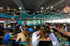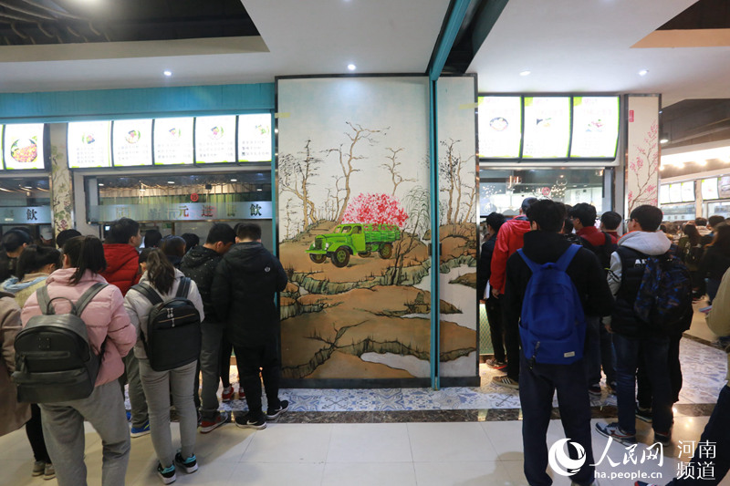 新學(xué)期開學(xué),鄭州華北水利水電學(xué)校的學(xué)生們發(fā)現(xiàn),學(xué)校食堂發(fā)生了巨大變化,曾經(jīng)冷冷清清的餐廳如今卻人頭攢動,熱鬧非凡。2月26日,在河南鄭州華北水利水電大學(xué),記者看到,學(xué)生們排隊(duì)在裝扮一新的學(xué)校食堂里就餐。曾經(jīng)的硬座桌凳換成了軟座桌椅,屋頂以星空為主題背景,獨(dú)特的燈飾造型,十二星座圖案,山水、動物、人物繪畫,池塘里游來游去的金魚、蓮藕將環(huán)境布置的十分溫馨、雅致,炫美。據(jù)學(xué)校食堂承包方負(fù)責(zé)人稱,為了給學(xué)生們營造良好的就餐環(huán)境,他們投資近200萬元將學(xué)校餐廳改造一新,呈現(xiàn)出了全新的風(fēng)格!碍h(huán)境變美了,但飯菜質(zhì)量和價(jià)格沒變,依然和過去一樣!睏钫A/攝 -