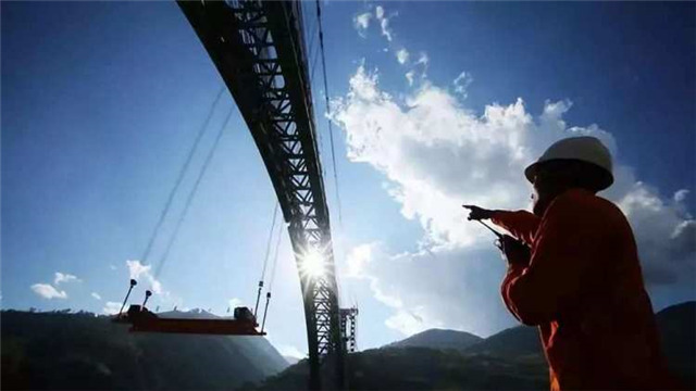 大橋建設(shè)工序復(fù)雜,精度要求高,建設(shè)者采用先進(jìn)的BIM建造技術(shù),同時(shí)創(chuàng)新采用“大噸位橫移式纜索吊機(jī)”和“多扣塔斜拉扣掛懸臂拼裝體系”等多項(xiàng)代表鐵路拱橋建設(shè)世界領(lǐng)先水平的前沿技術(shù),對(duì)2000多個(gè)測量點(diǎn)實(shí)施上萬次監(jiān)測,全橋鋼桁拱的精度誤差不超過3毫米。(圖為:技術(shù)人員指揮鋼桿件吊裝資料圖)