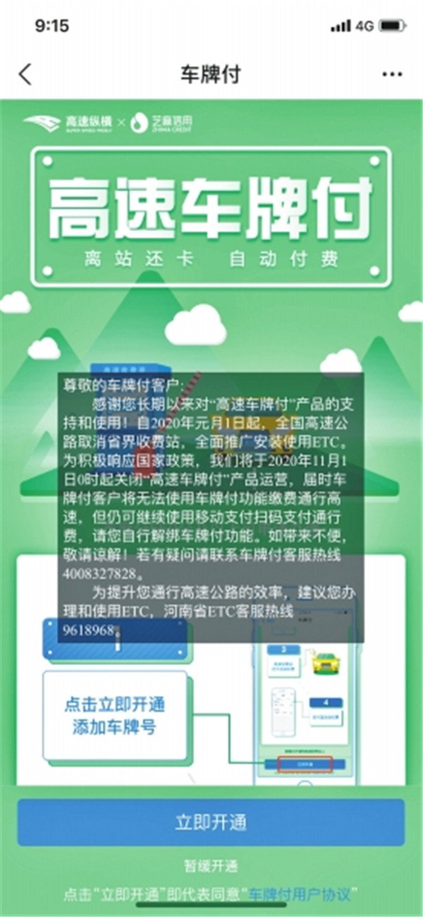 需要提醒的是,該功能停止后,“車牌付”用戶可自行解綁注冊(cè)。不過(guò)移動(dòng)掃碼支付通行費(fèi)仍可繼續(xù)使用。若有疑問(wèn),可聯(lián)系“車牌付”客服熱線4008327828。