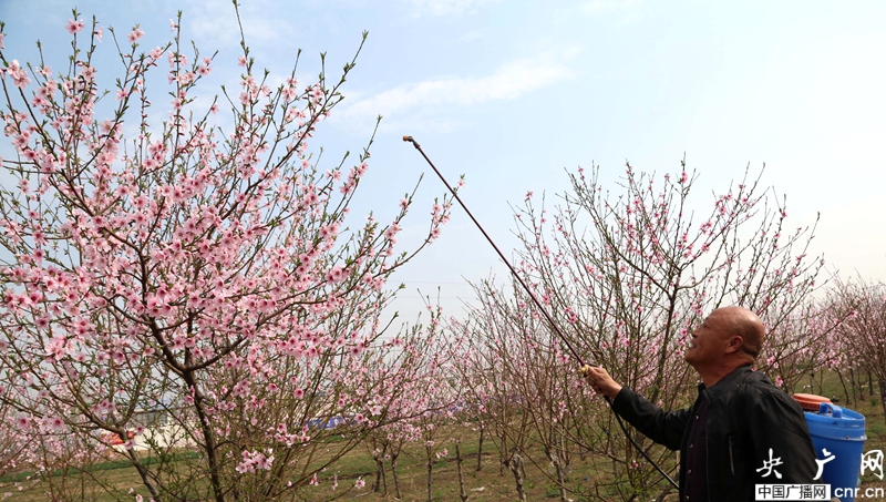 3月22日,河南省寶豐縣肖旗鄉(xiāng)果農(nóng)在桃花盛開的果園里為桃花打藥防病。