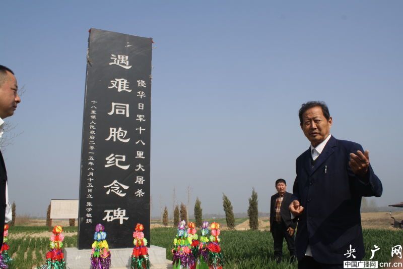 十八里鎮(zhèn)黨委副書記、鎮(zhèn)長張玉海對張先生的義舉表示肯定,他認(rèn)為,在近期日本刪減教科書中的南京大屠殺內(nèi)容、正式施行新修改的安保法的嚴(yán)峻背景下,在彰顯日軍又一大屠殺鐵證的“十八里村遇難同胞紀(jì)念碑”舉行祭奠儀式,意在深切緬懷70多年前遭到日寇屠殺的184位同胞,同時深情致敬在抗日戰(zhàn)爭中英勇犧牲的千千萬萬革命英烈。