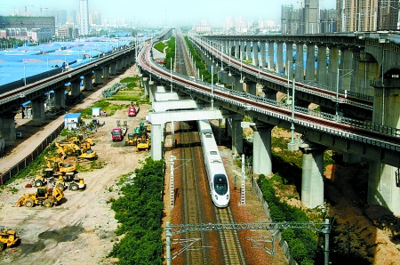 中廣網(wǎng)河南分網(wǎng)消息 據(jù)河南日?qǐng)?bào)報(bào)道:5月21日,一列由鄭州開往上海方向的動(dòng)車從隴海鐵路線上駛過,在其上方,是剛剛建成的石武客專鄭州東聯(lián)絡(luò)線。隨著石武客專主體工程的完工,由石武客專連接老鄭州東站的聯(lián)絡(luò)線在鄭州東形成了五線并聯(lián)、三層立體交叉的壯觀景象。 孫繼平 攝