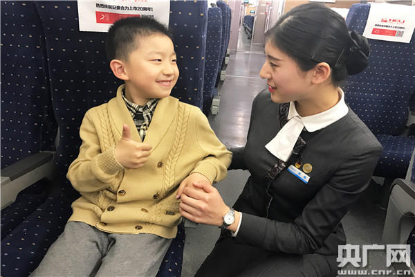 央廣網(wǎng)武漢5月4日消息(通訊員易娜)在宜昌東開往北京西的G516次動(dòng)車上,獨(dú)自帶著自己孩子乘車的武女士因?yàn)檗k理了車票延長而沒有座位在車廂內(nèi)徘徊。乘務(wù)員看到以后立刻將她帶到了人不多的餐車車廂并幫她安排好座位,乘務(wù)員的暖心舉動(dòng)讓她很感動(dòng)!拔腋杏X他們的服務(wù)特別熱情,我很感謝她們,因?yàn)槲易约簬Ш⒆釉谕饷嫱鄣模郧白哞F我得抱著她,這次坐高鐵,把我們領(lǐng)到這,我挺感謝她們的。”