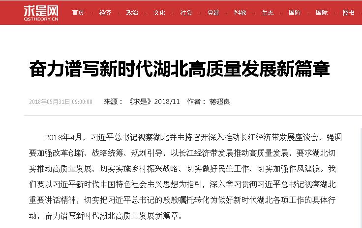 2018年4月,習(xí)近平總書記視察湖北并主持召開深入推動(dòng)長(zhǎng)江經(jīng)濟(jì)帶發(fā)展座談會(huì),強(qiáng)調(diào)要加強(qiáng)改革創(chuàng)新、戰(zhàn)略統(tǒng)籌、規(guī)劃引導(dǎo),以長(zhǎng)江經(jīng)濟(jì)帶發(fā)展推動(dòng)高質(zhì)量發(fā)展,要求湖北切實(shí)推動(dòng)高質(zhì)量發(fā)展、切實(shí)實(shí)施鄉(xiāng)村振興戰(zhàn)略、切實(shí)做好民生工作、切實(shí)加強(qiáng)作風(fēng)建設(shè)。我們要以習(xí)近平新時(shí)代中國(guó)特色社會(huì)主義思想為指引,深入學(xué)習(xí)貫徹習(xí)近平總書記視察湖北重要講話精神,切實(shí)把習(xí)近平總書記的殷殷囑托轉(zhuǎn)化為做好新時(shí)代湖北各項(xiàng)工作的具體行動(dòng),奮力譜寫新時(shí)代湖北高質(zhì)量發(fā)展新篇章。