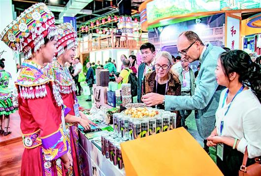 9月26日,外國游客在恩施硒博會展區(qū)挑選特色硒產(chǎn)品。第五屆世界硒都(恩施)硒產(chǎn)品博覽交易會開幕,352家企業(yè)的1340個產(chǎn)品亮相本屆硒博會。