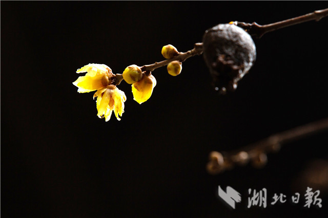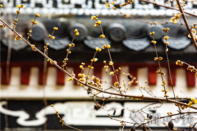 12月26日,在湖北秭歸屈原故里景區(qū)屈原祠內(nèi)拍攝的蠟梅。寒冬時節(jié),蠟梅盛放,花似蜜蠟,馨香肺腑,形成一道冬日溫情風(fēng)景線。(視界網(wǎng)王罡攝)