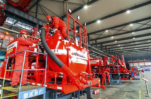 2月11日,位于荊州市的中國石化機(jī)械四機(jī)公司裝配集成廠,工人正在加緊生產(chǎn)第一季度出口訂單產(chǎn)品。春節(jié)期間,該公司科學(xué)調(diào)配產(chǎn)能、周密安排生產(chǎn)計劃,實(shí)現(xiàn)了出口安曼、印度等國的修井機(jī)、1300泵撬等油氣開采設(shè)備的順利總裝,部分設(shè)備已出口發(fā)運(yùn),實(shí)現(xiàn)了新春出口訂單“開門紅”。(視界網(wǎng) 黃志剛 攝)
