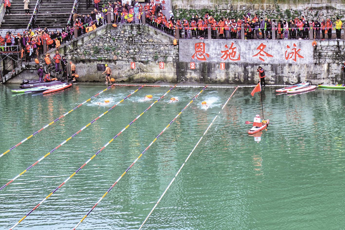 11月22日,游泳愛好者在恩施市城區(qū)清江河冬泳基地參加冬泳比賽。當(dāng)天,恩施州“百千萬”全民健身賽事活動(dòng)——2020年冬泳邀請(qǐng)賽暨水上救援演練如期舉行,來自湖北、浙江、重慶、河南等全國(guó)各地的300余名游泳愛好者,迎著小雪節(jié)氣,搏擊清江,挑戰(zhàn)嚴(yán)寒,上演一場(chǎng)“速度與激情”大戲。