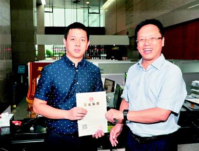圖為:企業(yè)負(fù)責(zé)人(左)從武漢市工商局局長(zhǎng)劉濤手中領(lǐng)到首張“28證合一”工商執(zhí)照
