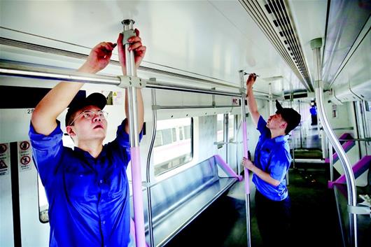圖為8月2日,地鐵2號(hào)線首批33輛列車全部完成架修工作,重獲新生后繼續(xù)投入運(yùn)營(yíng)。圖為工作人員在列車內(nèi)部檢修 通訊員產(chǎn)啟斗黃彥供圖
