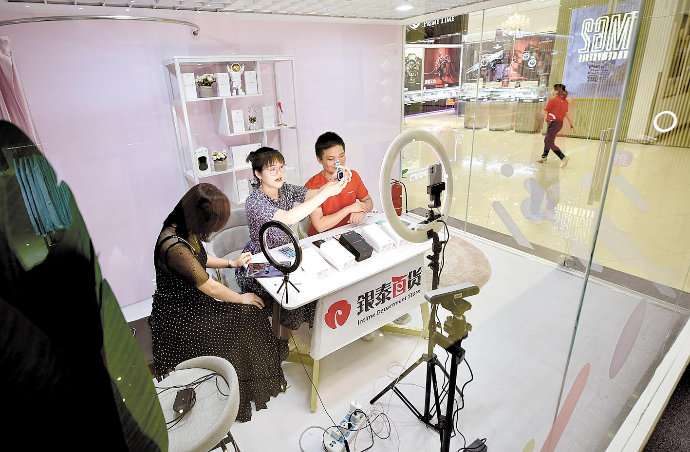 6月17日,武漢銀泰創(chuàng)意城共享直播間里,主播為華為手機、手表等產品進行帶貨直播!618電商大促”之際,線下商家也紛紛參與,共促武漢商業(yè)復蘇。 (湖北日報全媒記者 李溪 通訊員 唐雅倩 攝)