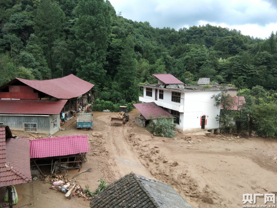 圖為當(dāng)?shù)亟M織機(jī)械正在回龍村開(kāi)展清淤工作(央廣網(wǎng)發(fā) 總臺(tái)央廣記者左艾甫 攝)