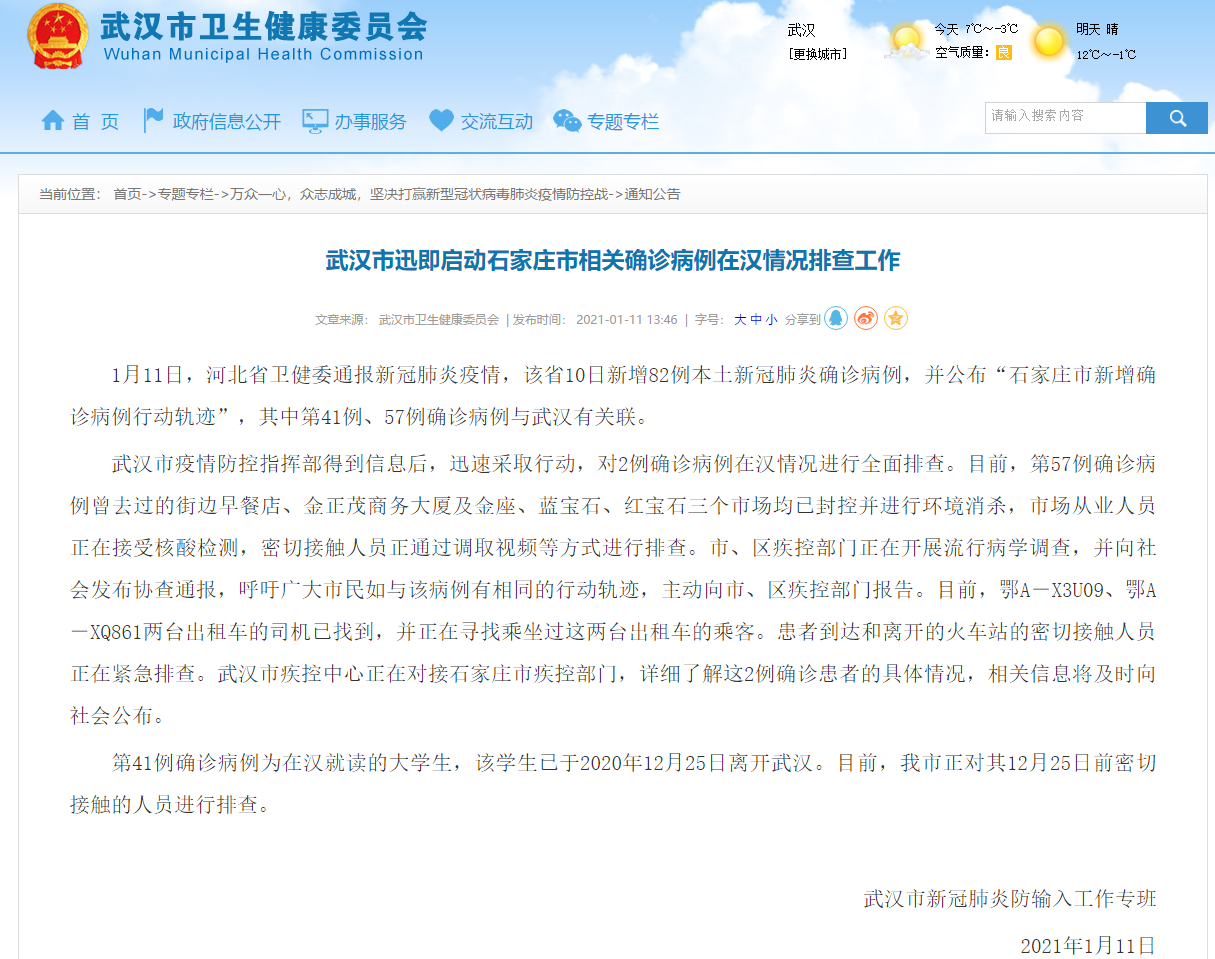 央廣網(wǎng)武漢1月11日消息(記者凌姝 張卓)據(jù)武漢市衛(wèi)生健康委員會1月11日通報顯示,河北省衛(wèi)健委通報“石家莊市新增確診病例行動軌跡”中第41例、57例確診病例與武漢有關(guān)聯(lián)。武漢市疫情防控指揮部得到信息后,迅速采取行動,對2例確診病例在漢情況進行全面排查。