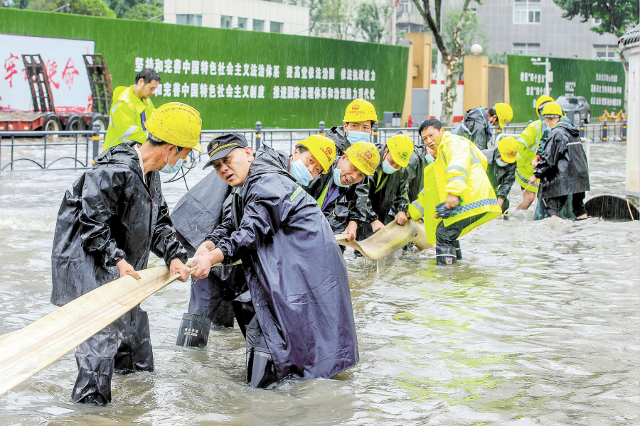 7月6日早晨,武漢市武昌區(qū)洪山路與東一路十字路口因大暴雨漬水,武昌區(qū)水務和城管搶險人員在現(xiàn)場拖管抽排漬水。