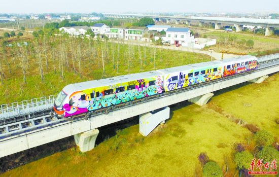 12月15日上午,畫滿涂鴉的磁浮專列從長沙榔梨站經(jīng)過。當(dāng)天,該專列完成“變裝”,從湖南磁浮公司綜合檢修庫駛出,與廣大市民朋友見面。列車兩面的作品由來自國內(nèi)外的20位涂鴉大師聯(lián)手創(chuàng)作,3節(jié)車廂共繪有6幅涂鴉作品,創(chuàng)作者通過構(gòu)圖彼此獨立、主題相互呼應(yīng)的彩色涂鴉,突出城市幸福感和軌道交通的綠色發(fā)展理念。