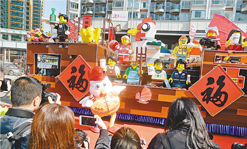 旅發(fā)局花車主題為“開年、開運(yùn)、開心”,花車全由LEGO砌成,不但有“雞”、“福”、“財(cái)神”等傳統(tǒng)裝飾,還有20個(gè)代表各行各業(yè)的樂(lè)高人向市民拜年,其中“樂(lè)高雞”由22萬(wàn)塊積木砌成、“財(cái)神”由8萬(wàn)塊積木砌成,十分矚目。