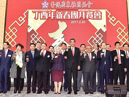 (香港之聲《新聞時空》)香港廣東社團總會昨天(20日)舉行丁酉年新春團拜餐會。香港特區(qū)行政長官梁振英、中央政府駐港聯(lián)絡辦副主任楊健等應邀擔任主禮嘉賓,共賀新春。