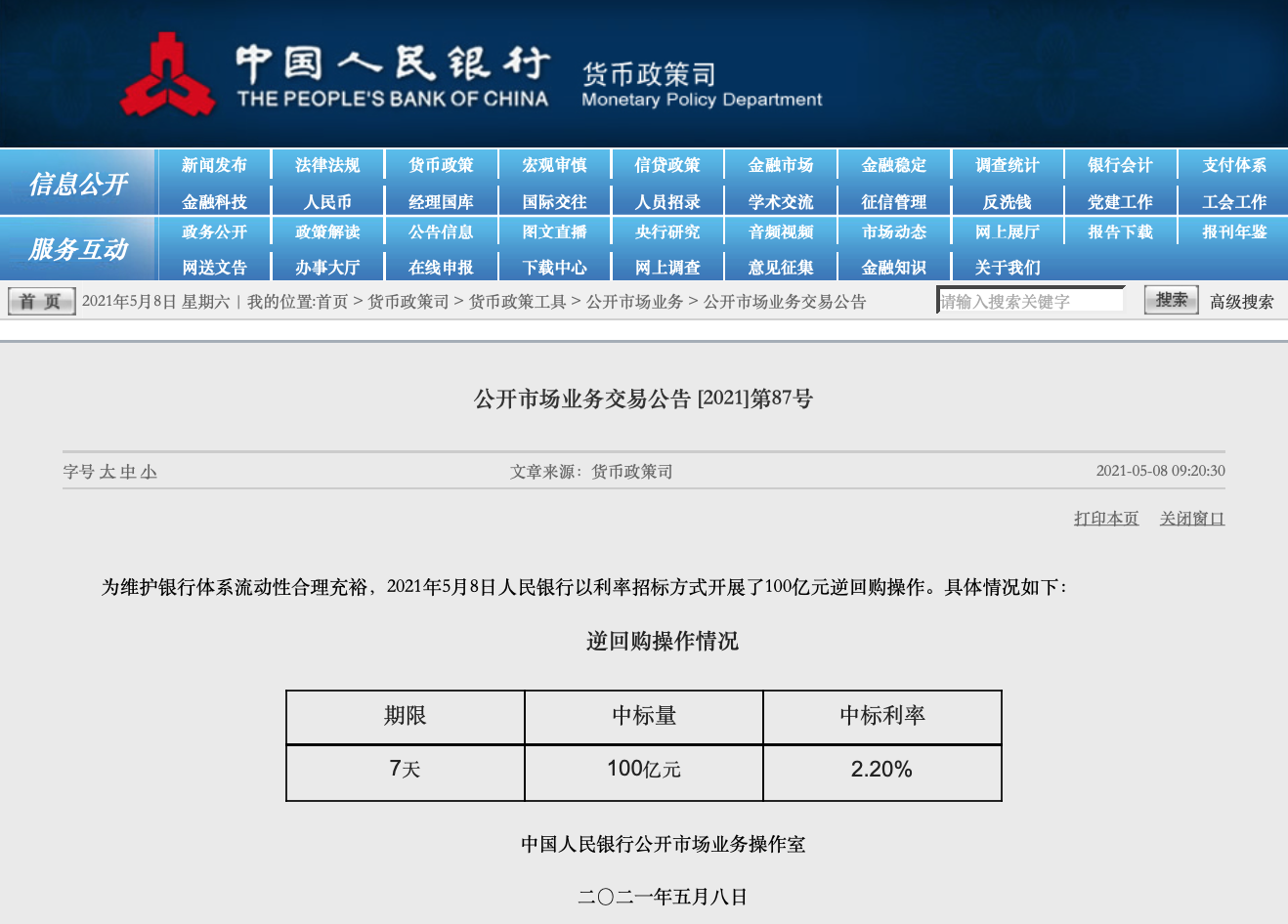 央廣網(wǎng)北京5月8日消息(記者 張圣琪)記者從央行網(wǎng)站了解到,中國(guó)央行公開市場(chǎng)進(jìn)行100億元7天期逆回購(gòu)操作,無(wú)逆回購(gòu)到期;中標(biāo)利率2.2%,與此前持平。