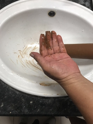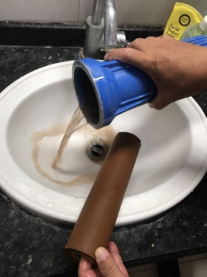 業(yè)主于先生家里安裝了一套雙級精密過濾器,水管盡頭還接有一套家用軟水機,為了讓記者清楚了解水質(zhì)的情況,他取出了一個過濾器中的PE棉過濾芯。大家都知道過濾芯是白色的,一般情況下,可以用6個月,剛用一個月的時候,顏色是不會發(fā)生太大變化的,而記者在王先生家里看到的過濾芯,使用一個月后已經(jīng)變成了深泥黃色,之后倒出的水類似渾濁的泥水,手伸進過濾器后,可以從底部掏出大量泥沙等雜質(zhì)。