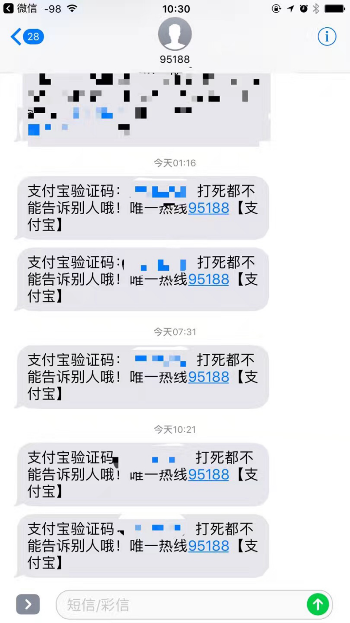 Jack:“突然一長串號(hào)碼,發(fā)來一條短信,自稱是支付寶,里面有一個(gè)幾位數(shù)字的驗(yàn)證碼。我也不知道這條短信要干嘛,上面就說給你這個(gè)驗(yàn)證碼,不要把這個(gè)驗(yàn)證碼給別人!