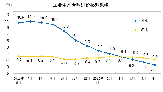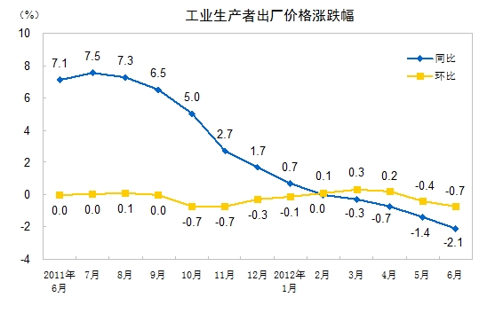 2012-07-09 09:58 來源:中國廣播網(wǎng)我要評論中廣網(wǎng)北京7月9日消息 國家統(tǒng)計局今日公布的數(shù)據(jù)顯示,2012年6月份,全國工業(yè)生產(chǎn)者出廠價格同比下降2.1%,環(huán)比下降0.7%。工業(yè)生產(chǎn)者購進價格同比下降2.5%,環(huán)比下降0.8%。上半年,工業(yè)生產(chǎn)者出廠價格同比下降0.6%,工業(yè)生產(chǎn)者購進價格同比下降0.3%。