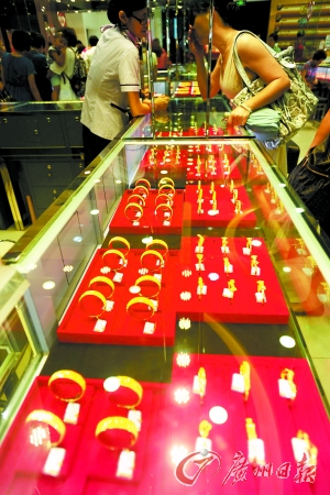 另外,廣東市場是全國最早推行“價費分離”機制的城市,2005年開始,廣東商家已全面推行千足金首飾價格與工費分離標價的方法;比如當日商場某品牌的千足金價格318元每克,但其各類首飾的價格工費差異可能達到上百元。