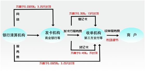 一般,銀行卡刷卡手續(xù)費(fèi)主要分為三部分:收單服務(wù)費(fèi)、發(fā)卡行服務(wù)費(fèi)和網(wǎng)絡(luò)服務(wù)費(fèi)。新政實(shí)施后,銀行卡刷卡手續(xù)費(fèi)的收取如下圖所示。(注:借記卡指儲(chǔ)蓄卡一類;貸記卡指信用卡一類)