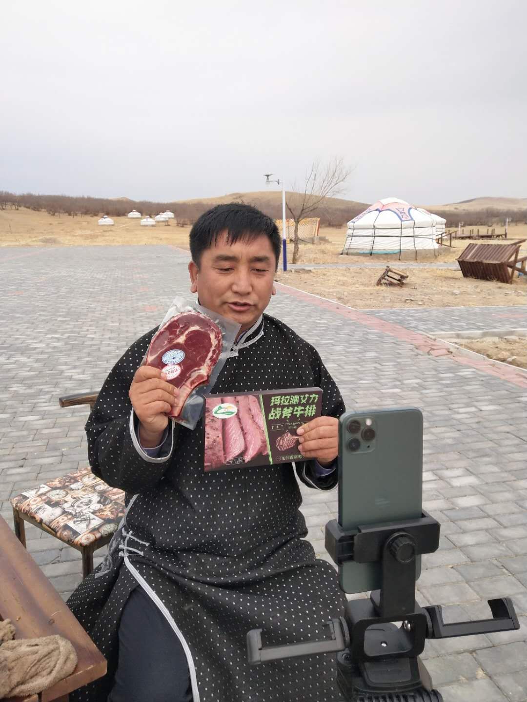 吳云波在短視頻平臺直播帶貨,銷售家鄉(xiāng)牛肉。(受訪者供圖)