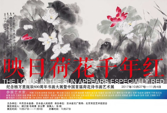 央廣網(wǎng)北京11月1日消息(記者劉思強(qiáng))2017年10月27日,為紀(jì)念楊萬里誕辰890周年,映日荷花千年紅書畫展在江西省吉水縣開展。該展由中共吉水縣委、吉水縣人民政府主辦,吉水縣文廣新局、北京宋莊藝術(shù)促進(jìn)會展承辦,展覽由胡介報(bào)、毛曉青、安云霽發(fā)起,張航策展。