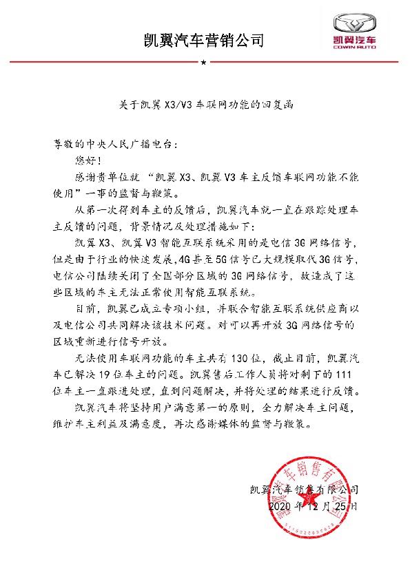 節(jié)目播出后,凱翼汽車銷售有限公司發(fā)來回復函表示,凱翼X3、凱翼V3智能互聯(lián)系統(tǒng)無法正常使用,是由于全國部分區(qū)域已經(jīng)無法正常使用3G網(wǎng)絡信號。