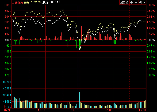 收評:滬指巨震漲1.54%上5000點 成交超兩萬億