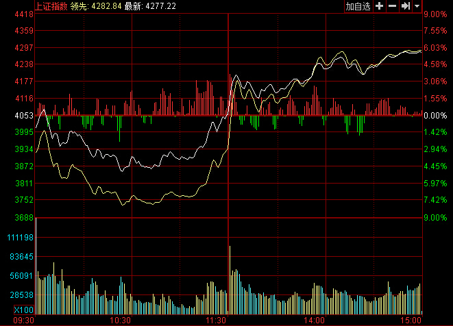 截止收盤,滬指報(bào)4277.22點(diǎn),漲224.19點(diǎn),漲幅5.53%;深成指報(bào)14337.97點(diǎn),漲771.69點(diǎn),漲幅5.69%;創(chuàng)業(yè)板報(bào)2858.61點(diǎn),漲6.28點(diǎn),漲幅%。