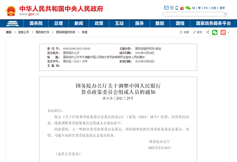 央廣網(wǎng)北京3月23日消息(記者蔣勇)據(jù)中央廣播電視總臺經(jīng)濟之聲《天下財經(jīng)》報道,國務院辦公廳近日發(fā)布通知,同意中國社會科學院國家高端智庫首席專家蔡昉、中國國際經(jīng)濟交流中心副理事長王一鳴擔任貨幣政策委員會委員,中國發(fā)展研究基金會副理事長劉世錦繼續(xù)擔任貨幣政策委員會委員,中國人民大學校長劉偉、清華大學金融與發(fā)展研究中心主任馬駿不再擔任貨幣政策委員會委員職務。