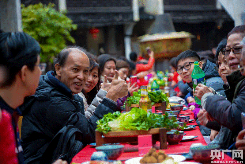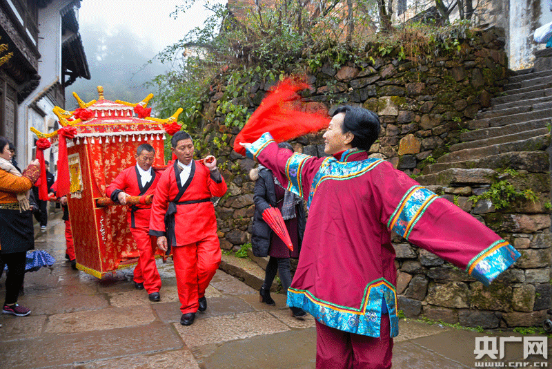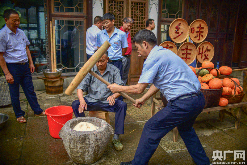 15日,一場徽州婚俗之旅,真實再現了古徽州傳統(tǒng)婚俗。其中的迎親儀仗隊、拜天地、拜高堂、掀蓋頭、撒粿籽等環(huán)節(jié),都取材于真實的古徽州婚嫁迎娶風俗。長街宴席,把天街占得滿滿當當,五湖四海的游客歡聚一堂,把酒言歡,感受地道的農家味道。22日,十多個石臼在眾屋廣場一字排開,數百人一起熱火朝天的打麻糍,場面很是壯觀。還有各種花樣民俗,讓你新奇不已,不由得想體驗一番。