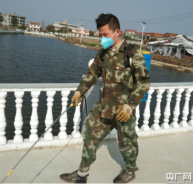 21歲的現(xiàn)役軍人陳杰在噴灑消毒液