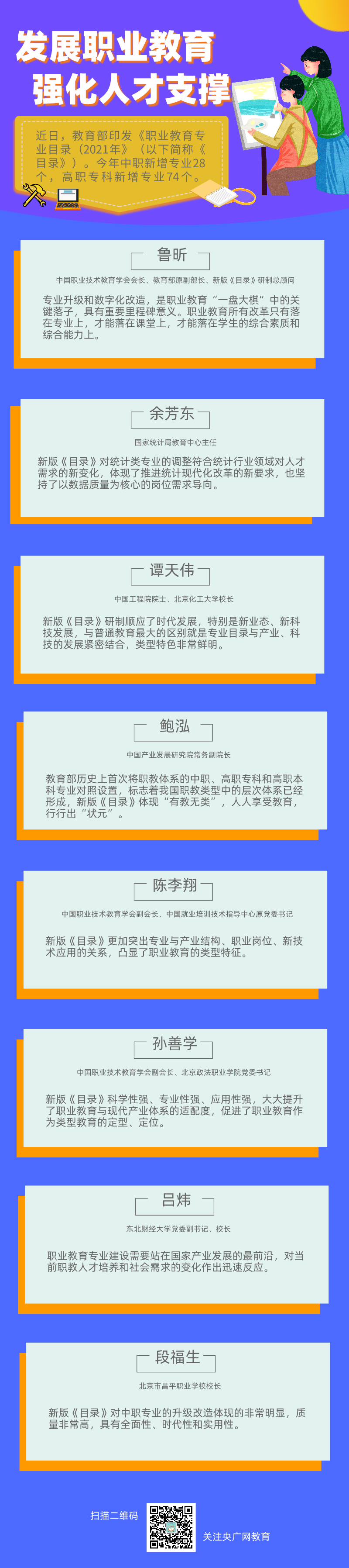 新版《目錄》分體現(xiàn)了專業(yè)升級(jí)和數(shù)字化改造理念,專業(yè)名稱等體現(xiàn)了政治性、科學(xué)性和規(guī)范性的有機(jī)統(tǒng)一,為提高職業(yè)教育適應(yīng)性、服務(wù)技能型社會(huì)建設(shè)和終身學(xué)習(xí)需求奠定了新基礎(chǔ)、樹(shù)立了新坐標(biāo)。