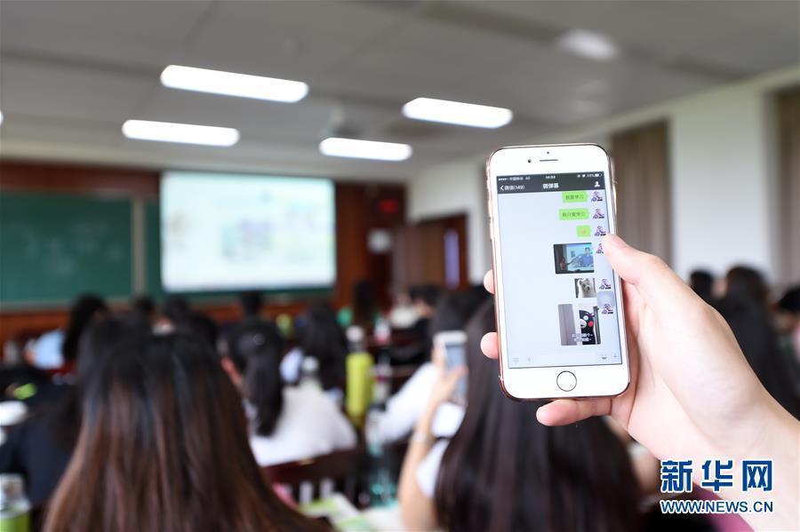 5月24日,一位同學在展示其通過微信“彈幕”發(fā)給老師和投影儀的內容。重慶大學新聞學院大二選修課《網絡與新媒體》放棄傳統(tǒng)課前點名方式,通過微信對學生進行定位簽到。課程通過微信記錄下的定位簽到記錄和課堂測驗記錄都將在期末折算成平時成績。該選修課授課老師還通過微信進行課堂教學,允許學生在課堂上隨時通過微信“彈幕”提問并與老師互動。新華社記者 唐奕 攝 圖片來源:新華網