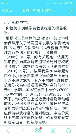 現(xiàn)代快報記者在網(wǎng)上搜了搜,無錫市物價局今年核定的運(yùn)河中學(xué)的收費(fèi)標(biāo)準(zhǔn)如下:“普通班”6500元/生·學(xué)期,“美術(shù)班”7000元/生·學(xué)期,允許上浮不超過30%,下浮不限。但對照該校招生辦給出的收費(fèi),無論是“精品班”還是“12人小班”,均大大超標(biāo)。記者當(dāng)即將此事反映給無錫市物價局價格舉報熱線,相關(guān)人員表示會盡快聯(lián)系處理。