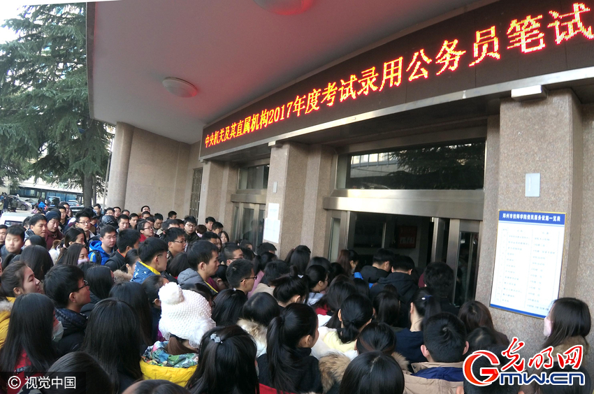 11月27日,2017年中央機關(guān)及其直屬機構(gòu)公務(wù)員招考筆試拉開序幕。據(jù)人社部發(fā)布的數(shù)據(jù)顯示,2017年國家公務(wù)員考試共有148.63萬人通過報名資格審查,較去年增加9.17萬人。也是新版《公務(wù)員考試錄用違紀違規(guī)行為處理辦法》實施后的首次國考,辦法規(guī)定考生作弊將永不錄用,被媒體用“最嚴”來描述本次國考紀律的嚴格程度。2017國考鄭州技師學(xué)院考場,考生開始進入考場參加筆試。沙浪/視覺中國