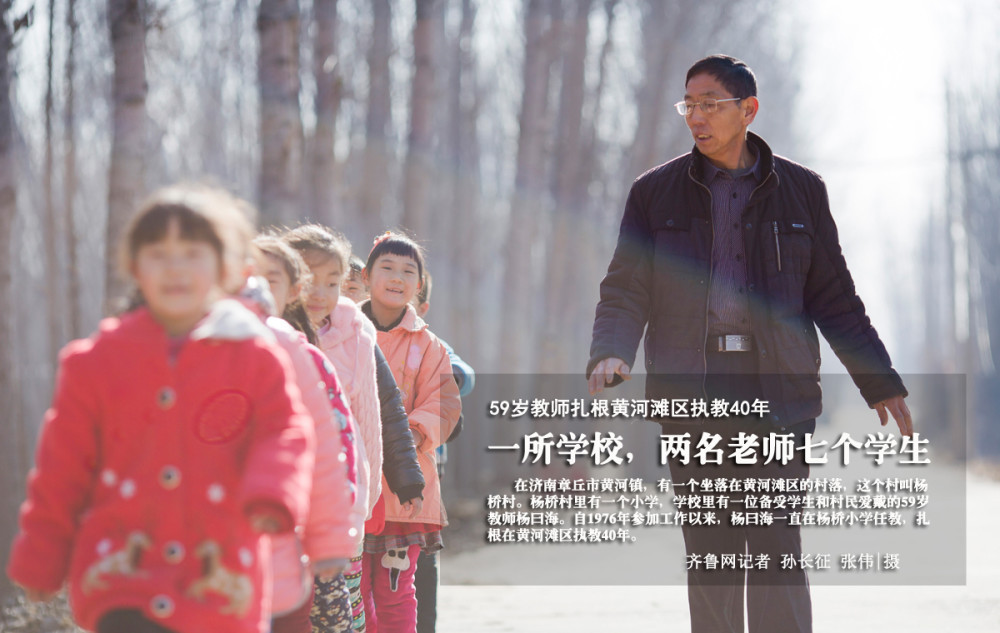 在濟(jì)南章丘市黃河鎮(zhèn),距離黃河不足1公里的灘區(qū)上,有一所只有兩名老師和七個(gè)學(xué)生的楊橋小學(xué)。近年來,隨著越來越多的村民外出打工,除了村里的留守兒童,學(xué)校里的學(xué)生越來越少。老師楊曰海今年已經(jīng)59歲了,自1976年參加工作以來,他便一直在這所小學(xué)任教,一干就是40年。另一位老師名叫邢兆蘭,她是楊曰海的學(xué)生,也是他的同事。1991年來到楊橋小學(xué)后,“師徒”兩人便扎根在這里教書育人,邢兆蘭也已經(jīng)在這里教了25年。齊魯網(wǎng)記者 孫長征 張偉|攝